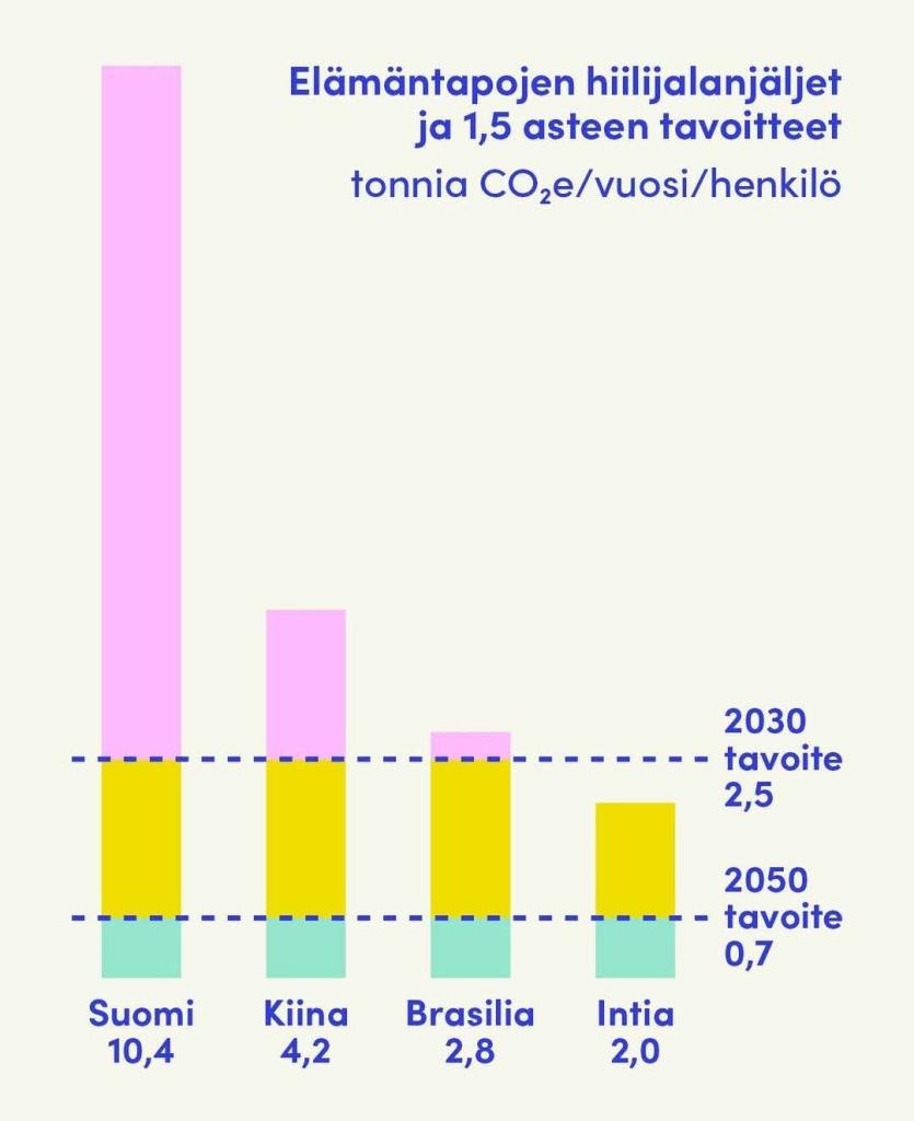 Niillä, joilla on eniten rahaa, on myös eniten vastuuta. Ja he ovat usein myös eniten vastuussa. Maapallon suurituloisin prosentti aiheuttaa tuplasti sen verran päästöjä kuin vähävaraisin puolisko ja rikkain kymmenys tupruttelee ilmakehään yli puolet kaikista maailman päästöistä! Ja tuo kymmenesosa ei koostu mistään miljonääreistä vaan muun muassa ihan tavallisista keskituloisista suomalaisista. Maailman rikkaimpaan kymmeneen prosenttiin pääsee, jos ansaitsee vuodessa noin 30 000 euroa. Tämä havainnollistaa mielestäni erinomaisesti sen, miksi meidän jokaisen panos hiilijalanjäljen pienentämisessä on olennaisen tärkeä.