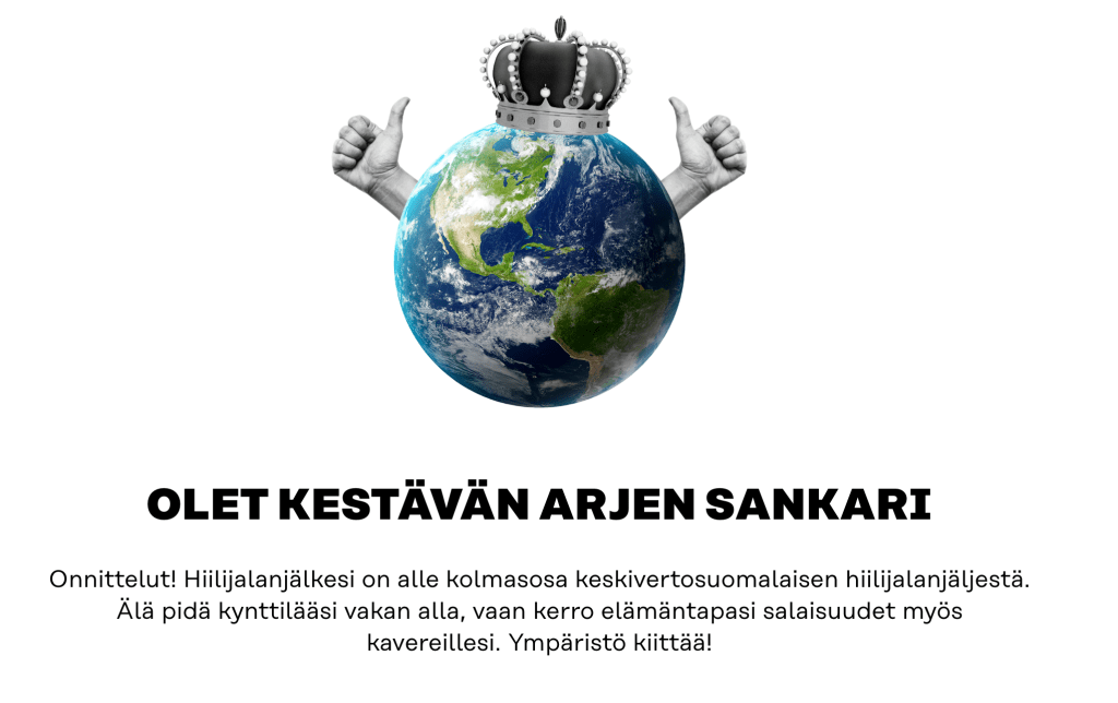 Jos haluat tehdä näkyväksi sitä, että pienellä hiilijalanjäljellä voi elää täysipainoista, mukavaa elämää, jaa oma hiilijalanjälkesi sosiaalisessa mediassa tägillä #pienestiparemmin. Tehdään vähemmän kuluttavasta elämäntavasta normi.