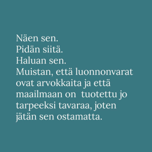 Haluaisin nähdä yhteiskunnan, jossa jatkuva kuluttaminen ja uuden ostaminen ei olisi normi. Jossa kaduilla voisi kulkea, bussissa istua, lehteä lukea, radiota kuunnella ja ihmisiä tavata ilman, että meille jatkuvasti luodaan tarpeiksi naamioituja ostohaluja. Ilman, että on jatkuvasti aktiivisesti ponnisteltava näitä ulkoapäin taitavasti luotuja “tarpeita” vastaan.