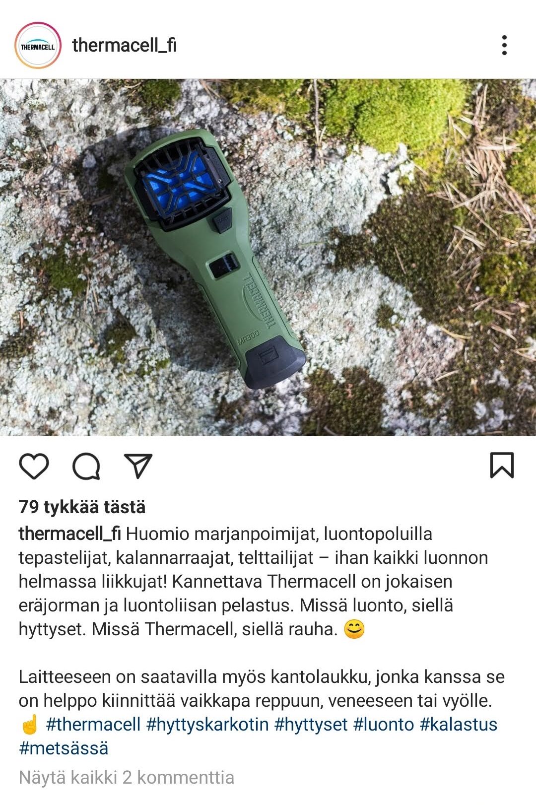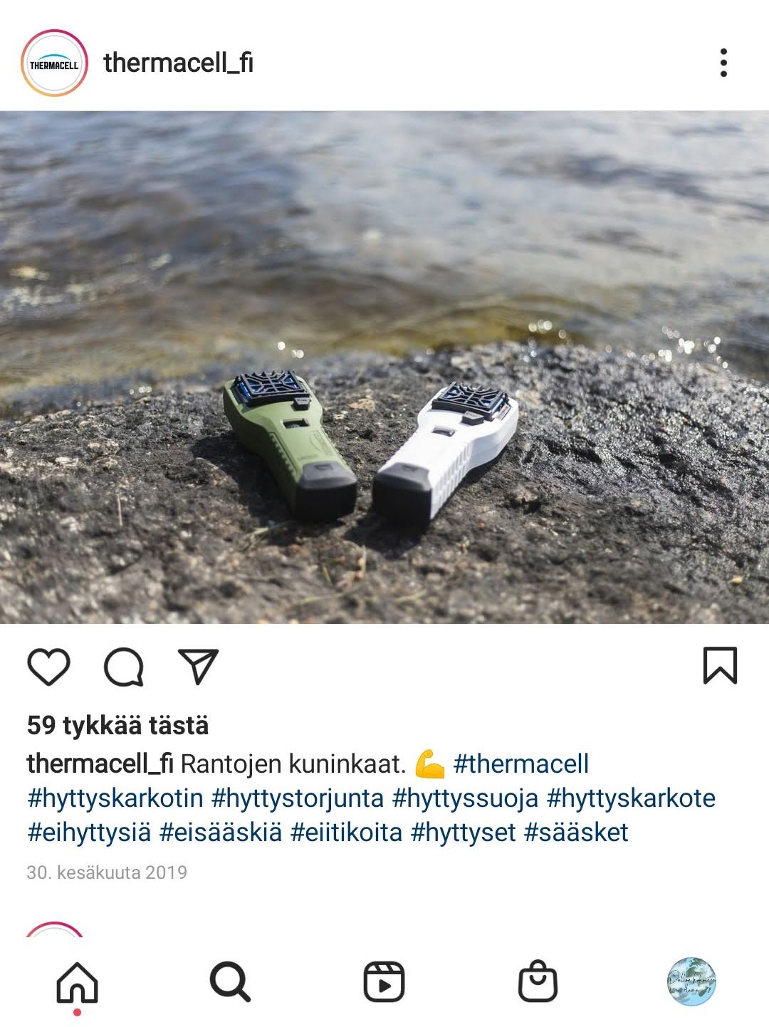 Thermacell-hyttystorjuntalaite nousi viime kesänä puheenaiheeksi aiheesta tekemäni blogipostauksen jälkeen. Twiittiketjuni saavutti tavoitti satoja tuhansia ihmisiä ja IG-julkaisukin tavoitti yli 61 tuhatta silmäparia – kiitos muiden aiheesta huolestuneiden kansalaisten. Vastuullisimmat retkeilykaupat vetivät tuotteen myynnistä pikaisesti ja mediassa julkaistiin niin hyönteistutkijoiden kuin kemikaaliturvallisuuden asiantuntijoiden näkemyksiä tuotteen turvallisuudesta. Yhteenvetona uutisista voidaan todeta: tuotteen turvallisuudesta ihmiselle ei ole varmuutta, ja haittoja ympäristölle sekä eri eliölajeille ei vielä ole edes tutkittu.