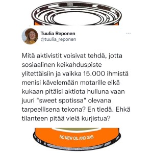 (Toki on helpompaa istua kotona ja kirjoittaa someen, että nyt en ainakaan ala aktivistiksi, koska aktivistit pilasivat aktivismin maineen. Tuskin kovin moni näistä huutelijoista oli marssimassa kaduille ja päättäjien eteen, vaikkei Auringonkukkien päälle olisi keittoa heitettykään.)