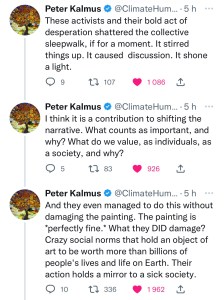 Van Goghin auringonkukkien äärellä jokainen voikin pysähtyä pohtimaan, onko tärkeämpää protestoida elinkelpoisen planeetan puolesta ”kiltisti” ja yleisesti hyväksytyillä keinoilla vai onko tärkeämpää saada ihmiset, erityisesti päättävässä asemassa olevat, heräämään keinolla millä hyvänsä (väkivalta pois lukien)? Missä tilanteissa ja mihin kohdistuva sabotaasi on edes jossain määrin hyväksyttävää?